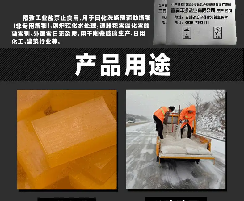 主要成分为氯化钠,以海水、地下卤水、岩盐为原料精制加工而成,产品分为精制工业盐与日晒工业盐,纯度高、杂质含量低,理化性能稳定。广泛应用于化工、冶金、玻璃制造、印染、水处理、道路融雪及建材添加剂等领域,是基础化工重要原料。产品按国标生产,颗粒均匀,溶解性好,适用于各类工业生产场景。包装密封防潮,便于储存运输。本品为工业专用,严禁食用、严禁用于食品加工,使用时需做好防护,妥善存放。